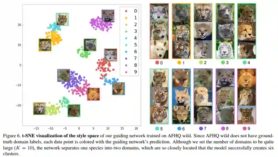 上图是在AFHQ野生类上训练的引导网络的t-SNE结果和来自每个域的示例图像。