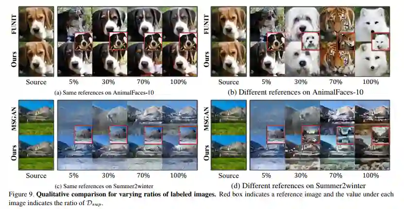 另外,作者在不同数据集上对比了FUNIT和MSGAN这俩最先进的多域和跨域图像到图像的翻译模型。实验结果表明,作者提出的方法能成功地实现域的分离和跨域的图像翻译。在半监督环境下,作者也声称其方法的性能优于当前现有的集合级监督方法。