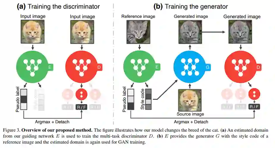 图注:方法概述如上,上图说明了模型转换猫品种的过程:1.使用引导网络的估计域训练多任务鉴别器;2.引导网络为生成器提供参考图像( reference image )的样式代码。另外,估计域再次用于GAN训练。