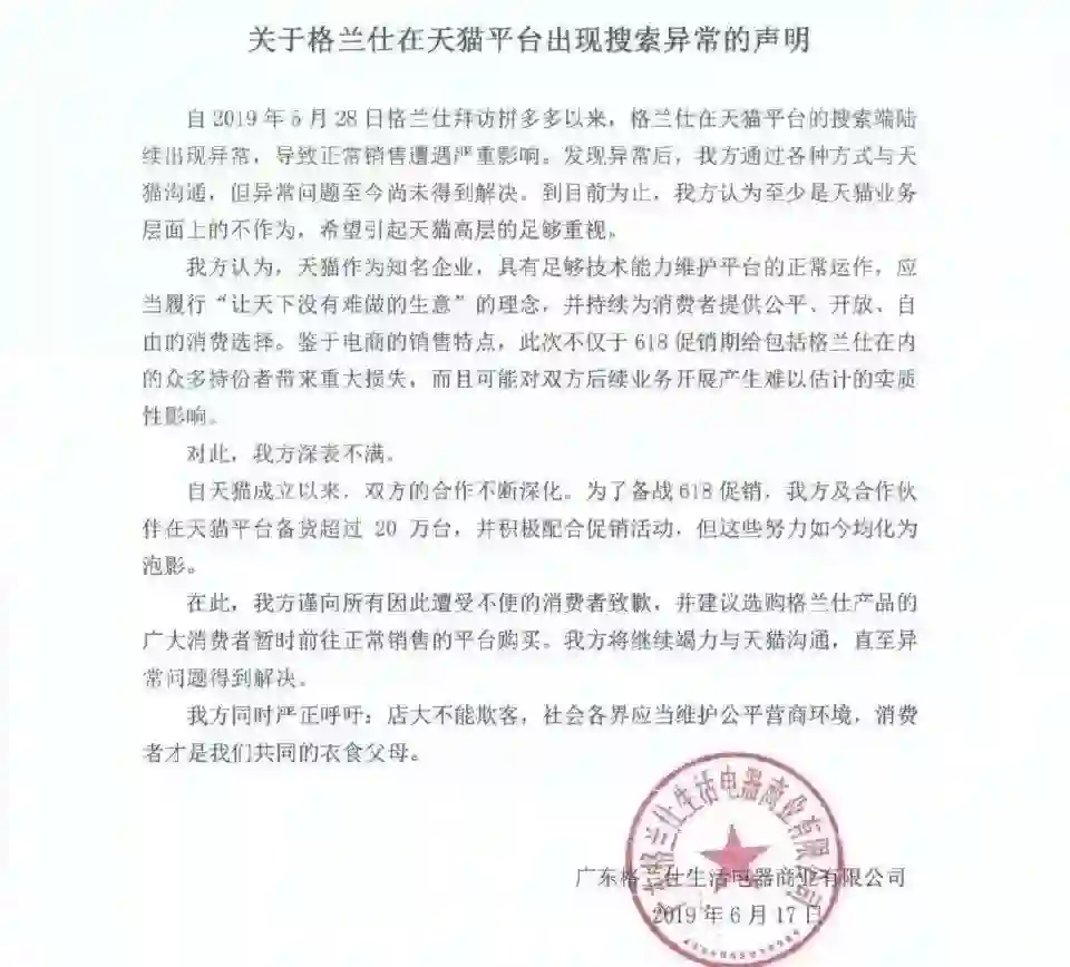 6月17日,格兰仕发布公告,指责天猫平台出现搜索异常,导致618销量遭遇严重影响。巧合的是,搜索出现异常,是从2019年5月28日,格兰仕拜访拼多多开始的。