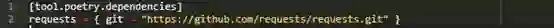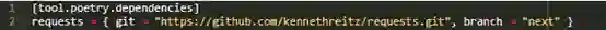 由于我们没有指定任何其他信息,所以Poetry假设我们打算使用主分支上的最新提交来构建我们的项目。您可以将git键与rev、tag或branch键组合在一起,用来指定其他东西。这里有个例子,说明您想要使用一个名为next的分支上最新的提交: