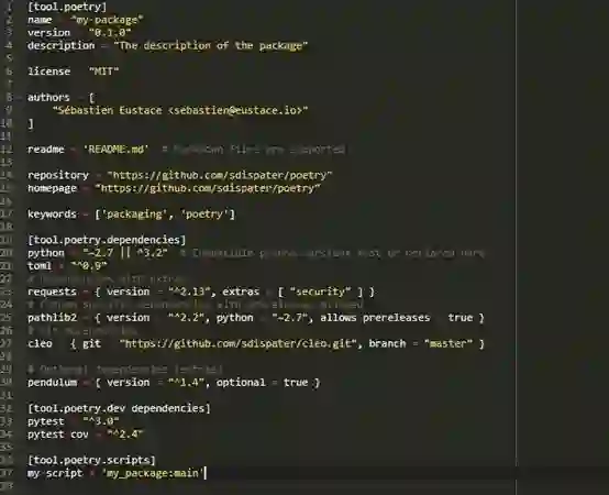 换句话说,poetry用pyproject.toml取代了setup.py, requirements.txt, setup.cfg, MANIFEST.in 以及最新加入的Pipfile。