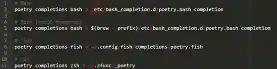 Poetry支持生成Bash、Fish和Zsh的自动补全脚本。完整细节请参阅poetry help completions,要点非常简单,只要使用以下命令中的某一个:
