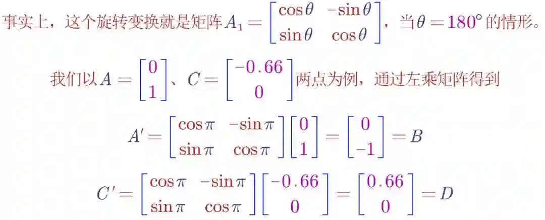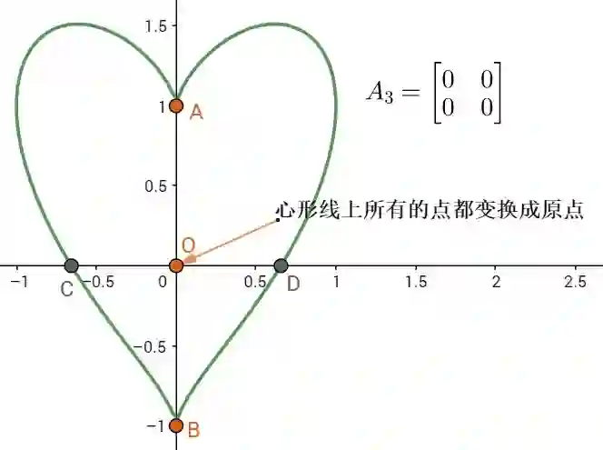 其余的点同理,于是我们得到了颠倒的心形(旋转了180度),从图像很容易看出来,旋转变换后的图形依然是二维的,所以,这个旋转矩阵A1的秩就是2。