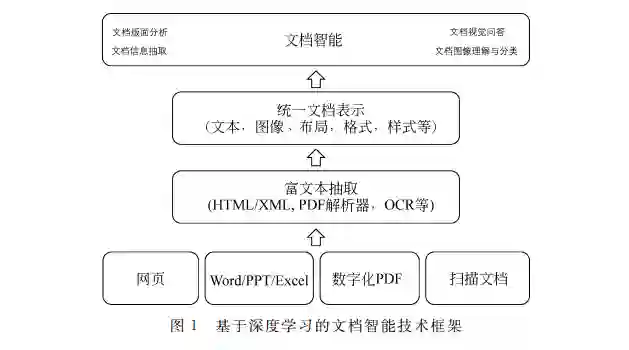 在过去的30年中, 文档智能的发展大致经历了三个阶段, 从简单的规则启发式方法逐渐进化至神经网络的方法。20世纪90年代初期,研究人员大多使用基于启发式规则的方法进行文档的理解与分 析,通过人工观察文档的布局信息,总结归纳一些处 理规则,对固定布局信息的文档进行处理。然而,传 统基于规则的方法往往需要较大的人力成本,而且 这些人工总结的规则可扩展性不强,因此研究人员 开始采用基于统计学习的方法。2000年以来,随着 机器学习技术的发展和进步,基于大规模标注数据 驱动的机器学习模型成了文档智能的主流方法,它 通过人工设计的特征模板,利用有监督学习的方式 在标注数据中学习不同特征的权重,以此来理解、分 析文档的内容和布局。然而,虽然传统的文档理解 和分析技术基于人工定制的规则或少量标注数据进 行学习,这些方法虽然能够带来一定程度的性能提 升,但由于定制规则和可学习的样本数量不足,其通 用性往往不尽如人意,而且针对不同类别文档的分 析迁移成本较高,这距离文档智能技术的实用化和 产业化还有相当一段距离。近年来,随着深度学习 技术的发展,以及大量无标注电子文档的积累,文档 分析与识别技术进入了一个全新的时代。图1是在 当前深度学习框架下文档智能技术的基本框架,其 中不同 类 型 的 文 档 通 过 内 容 提 取 工 具 (HTML/ XML抽取、PDF解析器、光学字符识别 OCR 等)将 文本内容、位置布局信息和视觉图像信息组织起来, 利用大规模预训练的深度神经网络进行分析,最终 完成各项下游应用任务,包括文档版面分析、文档信 息抽取、文档视觉问答以及文档图像分类等。深度 学习技术的出现,特别是以卷积神经网络(CNN)、 图神经网络(GNN)以及 Transformer架构[1]为代 表预训练技术的出现,彻底改变了传统机器学习需 要大量人工标注数据的前提,更多地依赖大量无标 注数据进行自监督学习,进而通过“预训练-微调”模 式来解决文档智能相关的应用任务,取得了显著性 突破。