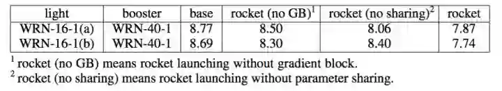 红色+黄色表示light net, 蓝色+红色表示booster net。(a)表示两个网络共享最底层的block,符合我们一般的共享结构的设计。(b)表示两网络共享每个group最底层的block,该种共享方式和AT在每个group之后进行attention transfer的概念一致。