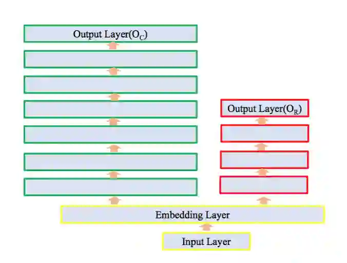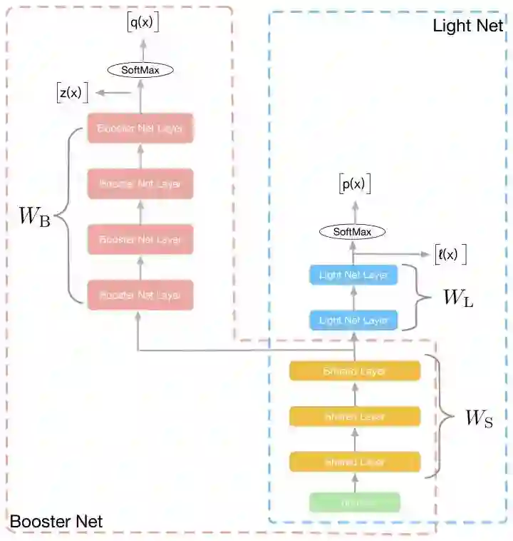 如图所示,训练阶段,我们同时学习两个网络:Light Net 和Booster Net, 两个网络共享部分信息。我们把大部分的模型理解为表示层学习和判别层学习,表示层学习的是对输入信息做一些高阶处理,而判别层则是和当前子task目标相关的学习,我们认为表示层的学习是可以共享的,如multi task learning中的思路。所以在我们的方法里,共享的信息为底层参数(如图像领域的前几个卷积层,NLP中的embedding), 这些底层参数能一定程度上反应了对输入信息的基本刻画。