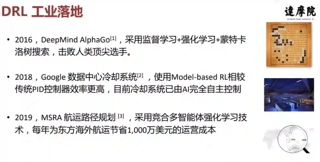 在工业落地方面,我选了两个国外的例子,一个是 Google 数据中心的冷却系统使用一种 Model-based RL 系统来控制温度,最终会比产品 PID 控制器的效率更高一些。目前谷歌宣称其冷却系统已经完全由 AI 自主控制。第二个例子是 MSRA 航运路径规划,它采用的是一种称为竞争合作的多智能体学习方法,并声称每年为其航运节省近千万美元的运营成本。
