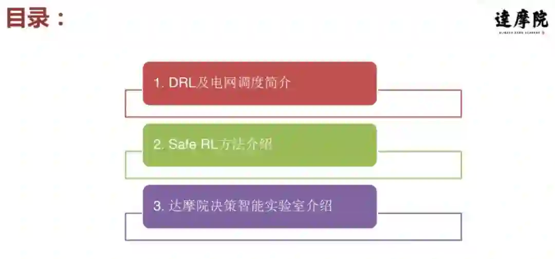 我今天的分享主要分为三部分:第一部分简单科普一下深度强化学习和电网调度;第二部分介绍一些安全强化学习的方法,及其在电网调度上的应用或和改进;第三部分简单介绍一下深度强化聚焦和强化学习。