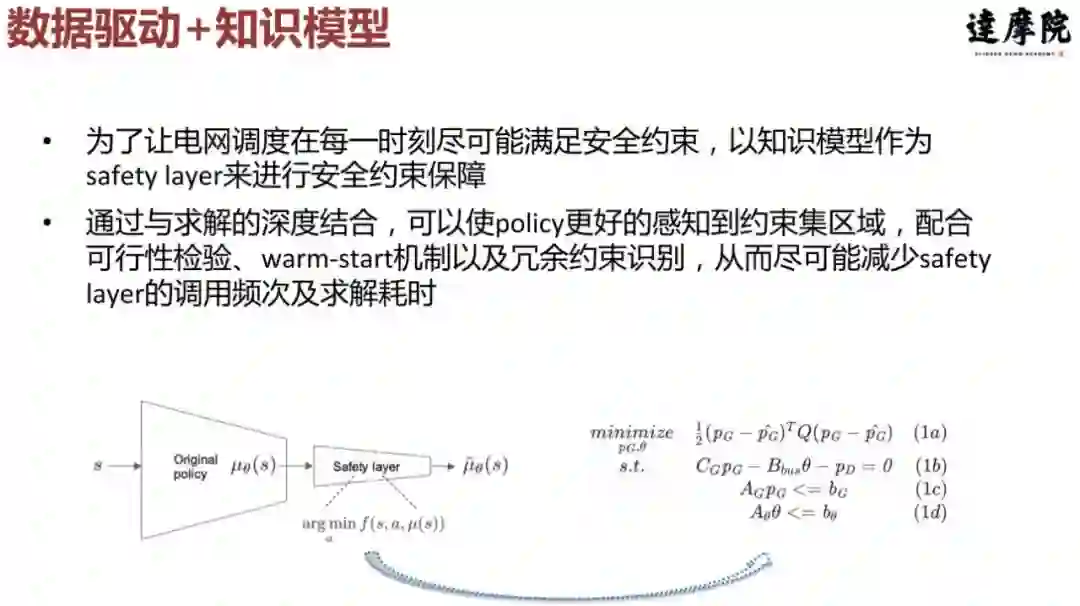 我们可以把强化学习和数学建模两种方法进行结合,以让每一时刻都不违反约束,我们以知识模型作为 safety layer 来进行安全约束保障。通过与求解的深度结合,可以使 policy 更好地感知到约束集区域,配合可行性检验、warm-start 机制以及冗余约束识别,从而尽可能减少 safety layer 的调用频次及求解耗时。