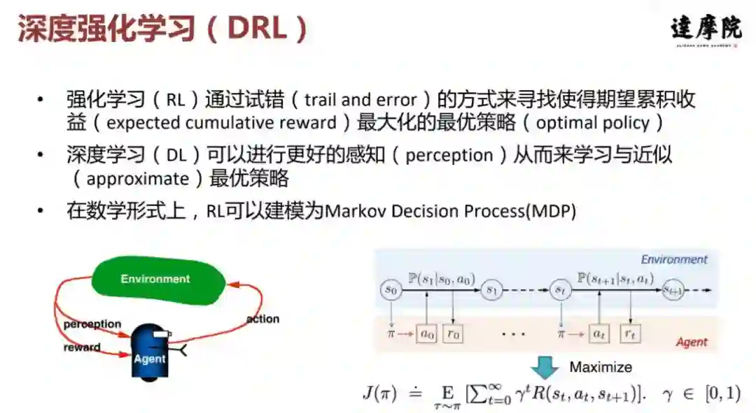 强化学习本质上是模仿人类去学习和改进的学习方式,需要跟环境不断交互,然后通过一种试错的方式来寻找最优策略。最优策略旨在最大化长期或累计收益。我们知道深度学习在感知领域做得非常好,因此深度学习也被拿来加持强化学习,帮助强化学习学到一个更好的最优策略。