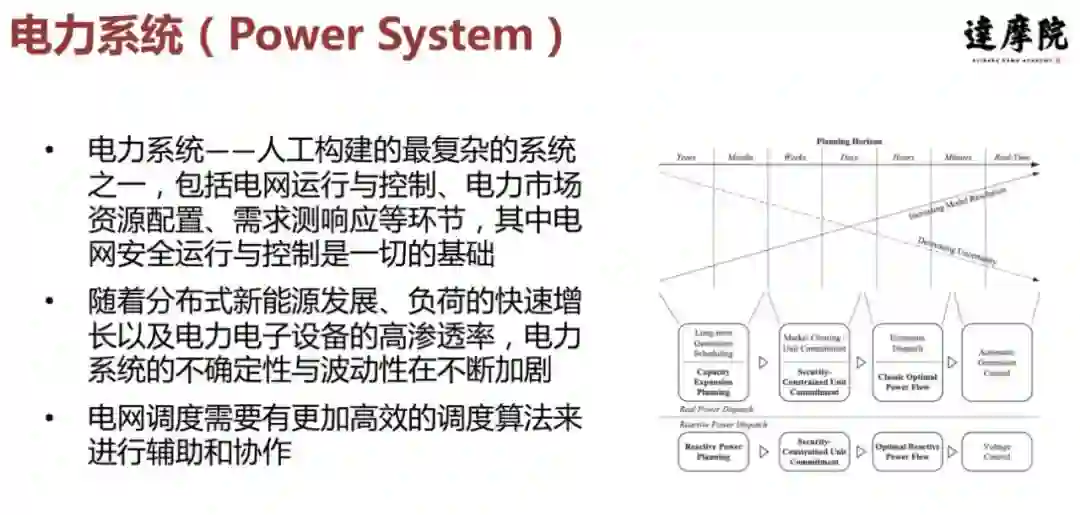 这就存在诸多挑战,其中一个挑战是安全性,一旦强化学习要落地到一些工业场景,安全性就是一个非常重要的问题。在具体讲安全强化学习之前,我先简单介绍一下电力系统,电力系统可以说是目前人工构建的最复杂系统之一,它主要的功能包括电网的运行与控制,电力市场的资源配置以及需求侧的响应等等,其中电网的安全运行与控制是一切的基础。近几年随着国家战略和新能源的发展,以及负荷的快速增长,一些电力电子设备加入到电网中,电力系统的不确定性和波动性在不断加剧,对于整个电力系统和电网调度来说,需要有一些更加高效的算法做出辅助决策。右边这个图展示的就是一个电网在不同时间尺度的不同控制方式。