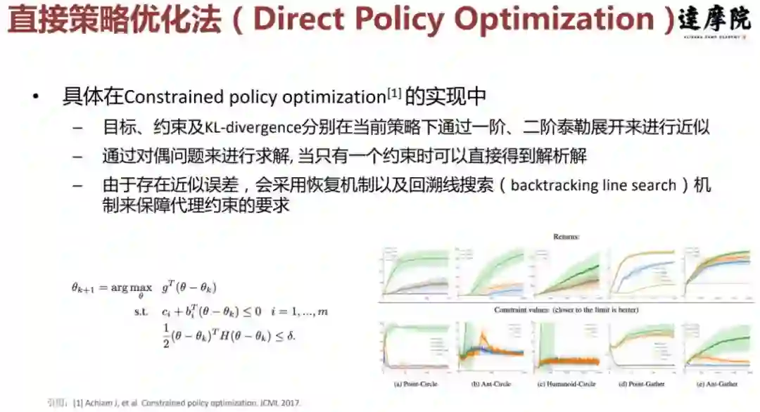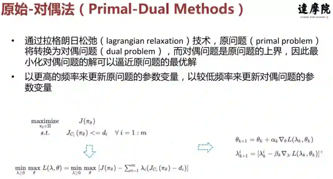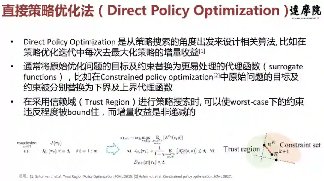 通常这一类方法是将原始优化问题的目标或约束替换为一个更易处理的代理函数。比如在 constrained policy optimization(CPO 算法)中原始问题的目标及约束被分别替换为下界及上界代理函数。当采用信赖域(Trust Region)进行策略搜索时, 可以使 worst-case 下的约束违反程度被 bound 住,而增量收益是非递减的。