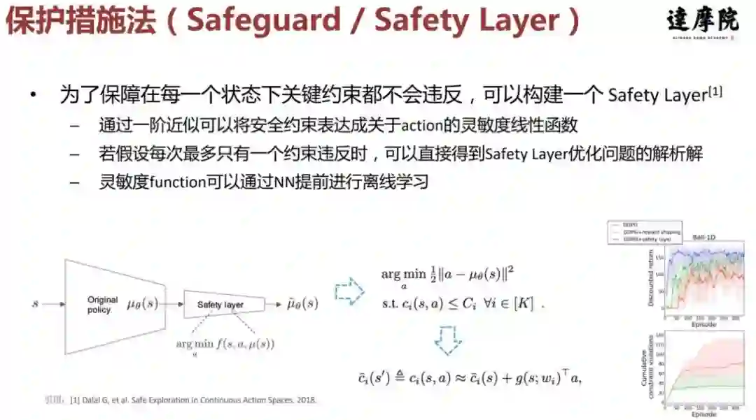 第四类方法就是需要有一种机制,以保证在每一个时刻下或每一个状态下,都不会违反约束。例如 2018 年有一篇论文就提出一个 safety layer 方法,采用了额外的保护措施。在该方法中,如果 action 违反了一些约束,就把它做一次调整或者做一次投影,以找到一个满足约束的解。这种方法实际上是把约束做了一些线性的近似,将约束表达成一个关于 action 灵敏度的线性函数。