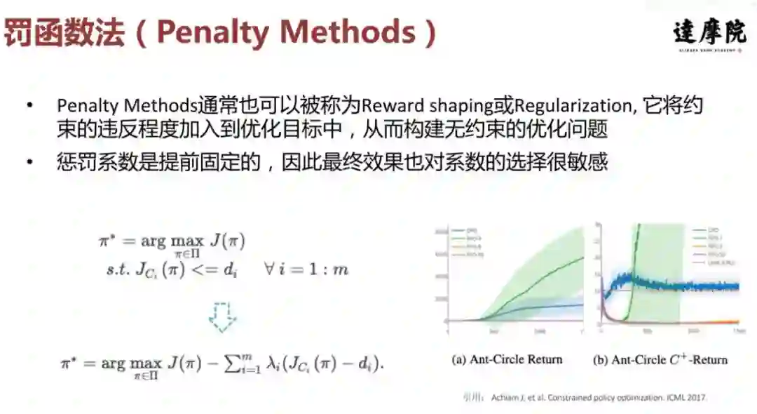 第一种方法罚函数法通常也可以被称为 Reward shaping 或 Regularization,也是所谓的正则化方法。通常来说这种方法会将约束的违反程度加入到优化目标中,从而构建无约束的优化问题,