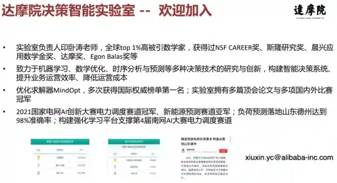 最后我介绍一下我们实验室,负责人是印卧涛老师,全球 top 1% 高被引数学家,获得过 NSF CAREER 奖、斯隆研究奖、晨兴应用数学金奖、达摩奖、Egon Balas 奖等。我们实验室致力于机器学习、数学优化、时序分析与预测等多种决策技术的研究与创新,构建智能决策系统、 提升业务运营效率、降低运营成本 。目前我们已取得的成果包括优化求解器 MindOpt,多次获得国际权威榜单第一名;实验室拥有多篇顶会论文,并获多项国内外比赛冠军。2021 我们获得国家电网 AI 创新大赛电力调度赛道冠军、新能源预测赛道亚军;负荷预测落地山东德州达到 98% 的准确率。目前我们正在构建强化学习平台来支撑第 4 届南网 AI 大赛电力调度赛道。感兴趣的同学可以联系我们,加入我们的实验室,相互学习,一起成长。