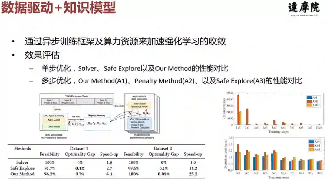 在实现的过程中,我们通过异步训练框架及算力资源来加速强化学习的收敛。从效果上讲,我们展示了两类结果,一类是单步优化,即如果一个问题能够通过数学建模表达出来,并且是个凸问题,求得的一定就是最优解,实验结果如下图左下角所示,在一个数据集上 96% 的概率下,解都是直接可行的,也满足安全因素,距离最优的 gap 不到 1%,在另外一个数据集上可行概率几乎达到 100%。如果每一个问题都用原始的 solver 去求解,提速可以达到 6 倍,甚至说提升了一个量级。
