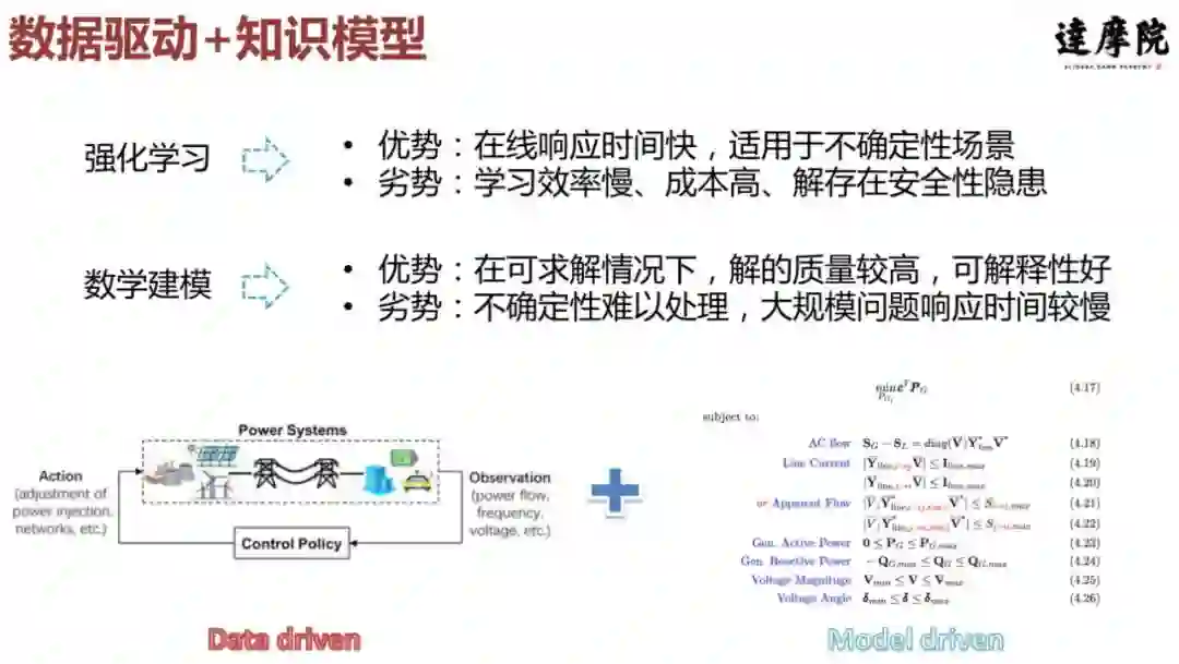 强化学习和知识模型本质上存在一些互补的优势。强化学习的优势是在线响应时间比较快,适用于不确定性场景;劣势是学习效率慢、成本高,解存在安全性隐患。而数学建模在电力领域已进行了多年研究,相对成熟。因此在可求解的情况下,解的质量会比较高,可解释性也比较好。数学建模的劣势就是对于大规模问题或不确定性问题,它的处理效果不是很好。