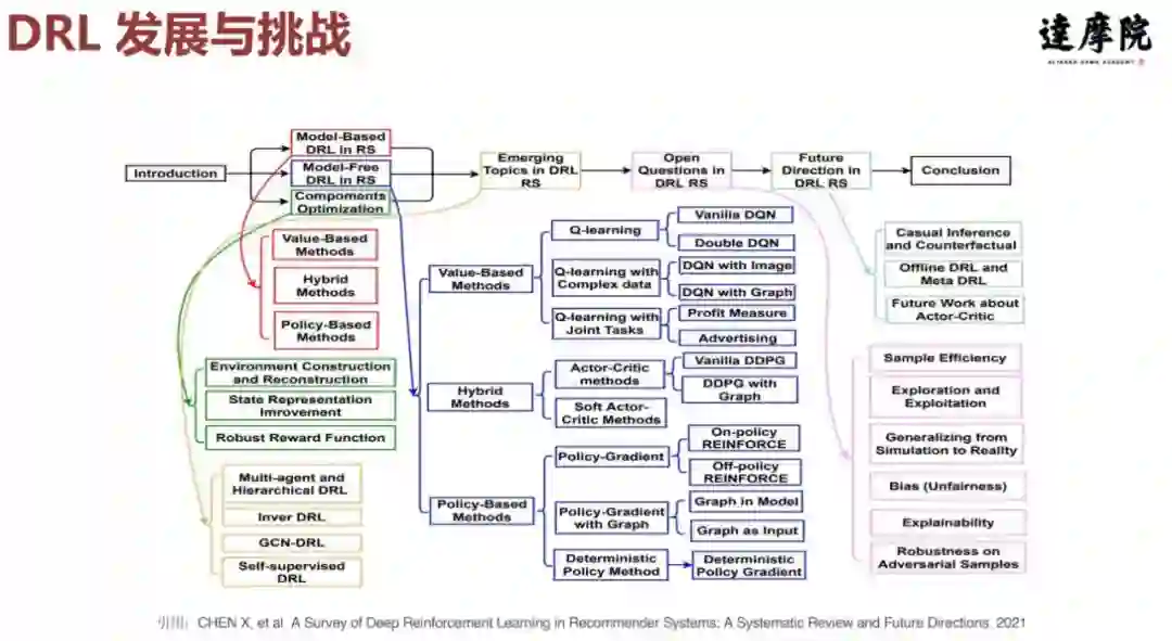 下面我再来说一下 DRL 系统的发展和挑战,下图是一个其他作者总结的图。我们可以发现强化学习主要是基于 AC 架构的算法,而强化学习的很多问题还是开放性问题,或者说还存在一些挑战,包括学习成本高、学习效率差。另一方面,强化学习要不断去探索设计新算法,并且很多强化学习算法是在仿真环境中改进的,算法成本确实非常高。