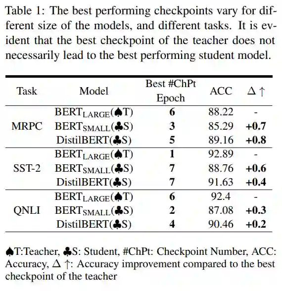 1. 检查点搜索问题:表现最好的教师模型 checkpoint 不一定是最适合蒸馏的教师,early-stopped checkpoint 没准反而是更好的教师模型。但搜索全部 checkpoint 非常耗时耗力,很难获取到最优的 checkpoint;下表展示了 BERT 系模型在不同数据集上的最优 checkpoint: