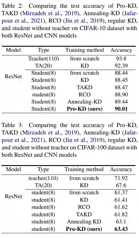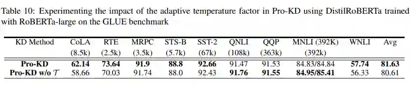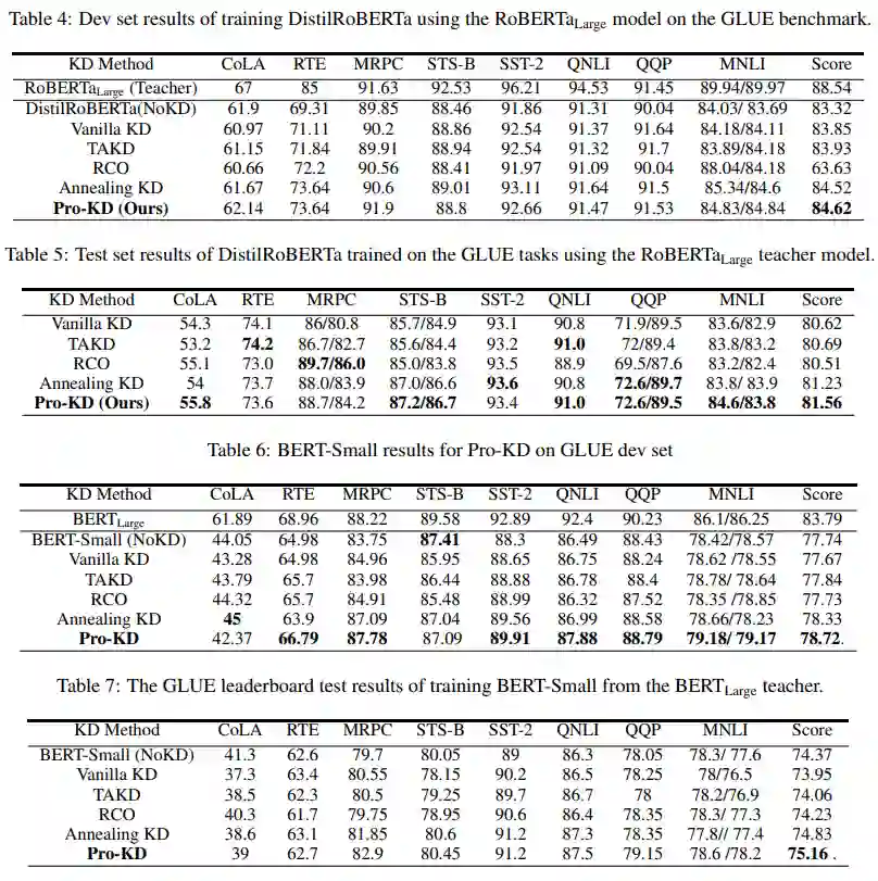 作者通过对 NLP(GLUE 基准和 SQuAD 1.1 和 2.0)和图像分类任务(CIFAR-10、CIFAR-100)的实验,表明了 Pro-KD 的有效性。