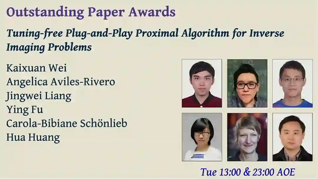 杰出论文1:On Learning Sets of Symmetric Elements链接:https://arxiv.org/pdf/2002.08599.pdf 学习无序集是一种基础的学习方法,近年来受到越来越多研究者的关注。这方面的研究场景通常是用特征向量来表示集合元素,而很少关注到,集合元素一般本身遵循其自身对称性。从消除影像脉冲到多视图三维形状识别和重建,这种情况涉及到许多应用。本文提出了一种学习一般对称元素集的原则方法。首先描述线性层的空间,这些层对于元素的重新排序和元素的内在对称性都是等价的,就像图像中的平移。进一步,我们进一步证明,由这些层组成的网络(对称元素层的深度集合)是不变和等变函数的通用近似器。DSS层的实现也很简单。最后,我们用图像、图形和点云进行了一系列实验,证明了这个模型的性能比现有的集学习架构有所改进。 杰出论文2:Tuning-free Plug-and-Play Proximal Algorithm for Inverse Imaging Problems链接:https://arxiv.org/pdf/2002.09611.pdf 即插即用(PnP)是将ADMM或高级降噪先验与近端算法相结合的非凸框架。最近,PnP取得了巨大的实验成功,特别是集成了基于深度学习的降噪器。但是,基于PnP的方法的关键问题是需要手动调整参数。成像条件和场景内容必须存在高度差异,才能获得高质量的结果。在这项工作中,我们提出了一种免调参的PnP近端算法,该算法可以自动调整内部参数,包括惩罚参数,降噪强度和终止时间。论文的关键部分是开发了一个用于参数自动搜索的策略网络,可以通过混合无模型和基于模型的深度强化学习来有效地学习这些参数。通过实验,我们证明了所学习的策略可以针对不同的状态自定义不同的参数,并且比现有的手工规则更有效。此外还讨论了如何将插入式降噪器与我们所学到的策略相结合可达到SOTA结果。这种方法在线性和非线性逆成像问题中很流行,尤其是在压缩感知MRI和相位恢复上取得了不错的结果。一作魏恺轩本科和硕士都就读于北京理工大学,目前是二年级的硕士研究生,师从付莹教授。在此期间,魏恺轩在2019年夏季作为剑桥大学的图像分析小组的访问学生,还曾与亚州微软研究院的杨蛟龙博士进行合作在CVPR 2020 发表了「A Physics-based Noise Formation Model for Extreme Low-light Raw Denoising」一文。 魏恺轩表示,自己的研究兴趣在于机器学习,深度学习,变异优化和统计建模/推理与计算摄影,计算成像和低级图像处理应用程序的交叉领域。还有两篇获得杰出论文荣誉提名奖:论文:Efficiently sampling functions from Gaussian process posteriors链接:https://arxiv.org/pdf/2002.09309.pdf论文:Generative Pretraining From Pixels链接:https://cdn.openai.com/papers/Generative_Pretraining_from_Pixels_V2.pdf时间考验奖ICML 2020 时间考验奖颁给了2010年的一项研究,第一作者是来自加州理工学院的 Niranjan Srinivas。Gaussian Process Optimization in the Bandit Setting: No Regret and Experimental Desig链接:https://arxiv.org/pdf/0912.3995.pdf该论文通过分析高斯过程的强盗优化,将贝叶斯优化、土匪优化和实验设计领域结合在一起,给出了一种基于互信息增益量导出有限样本界限的新方法。在过去的十年中,本文产生了深远的影响,包括方法本身,使用的证明技术和实际结果。在提名该奖项的论文时,本届委员会的成员对此论文给予了高度评价:「本文的研究结果影响了现代深度学习系统中当前的超参数搜索方法,并且该算法甚至在十年后仍然是一种流行的获取算法。最近的论文中引用了本文的定理和引理,并且他们的研究成果是在后续论文中借用的。从文本的技术深度和影响力来看,这篇论文明显脱颖而出。」「在过去的十年中,贝叶斯优化已成为解决许多机器学习问题的有力工具……证明中使用的数学技术极大地影响了后来的研究。」
