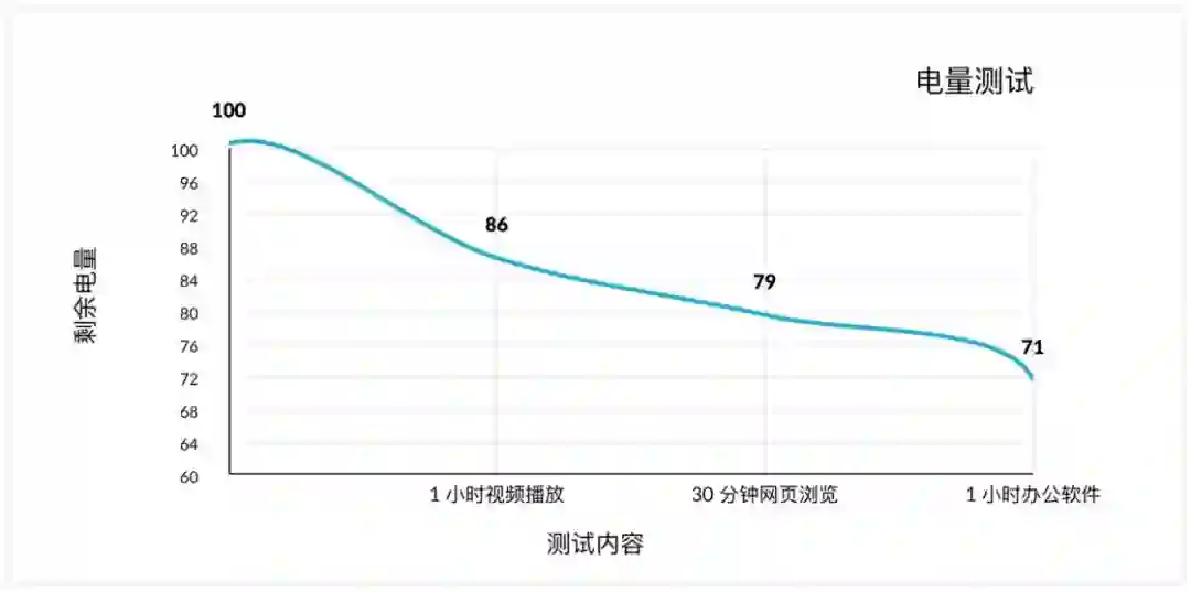 之后我又进行了一次更严谨的实际测试,进行了约 1 小时视频播放、30 分钟网页浏览、1 小时办公软件轻度办公(以 Word 和 Excel 为主),期间几乎不间断的播放音乐。2.5 个小时的中度工作娱乐之后,剩余电量仍然有 71%。