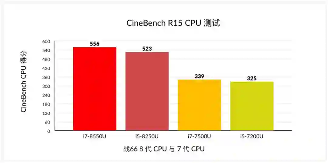 战 66 搭载了 Intel 的第 8 代酷睿处理器:i7-8550U,4 核 8 线程、8M 三级缓存、最高频率可达 4 GHz。光说数据可能没有直观的感受,8 代 CPU 较 7 代 CPU 究竟有多少提升?Intel 官方的说法是性能增加了 40%。