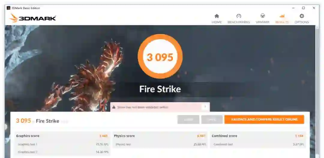 我使用 3D Mark 对电脑进行测试,最终得分为「3443」,显卡得分为「3095」,从分数上看,MX150 的性能大致在游戏本上的 GTX 950M 水平。