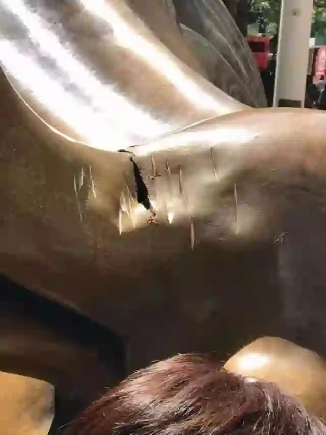 目击者称,7日12时30分左右,42岁的德克萨斯州达拉斯市人特冯·瓦莱克多次使用类似于班卓琴的大型金属物体敲击公牛的右侧牛角,并大喊大叫。目前还不清楚瓦莱克在对这尊深受欢迎的青铜雕塑实施狂暴行为时在嘀咕着什么,但他的攻击让雕像留下了破口并出现凹损。