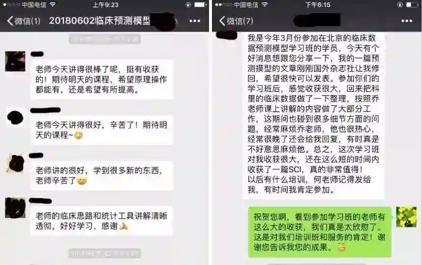 学员好评无数,前14期学员已有多人成功发表SCI论文。建微信群老师课后长期回答学员所有问题;独家课后发放课堂同步视频,供学员复习
