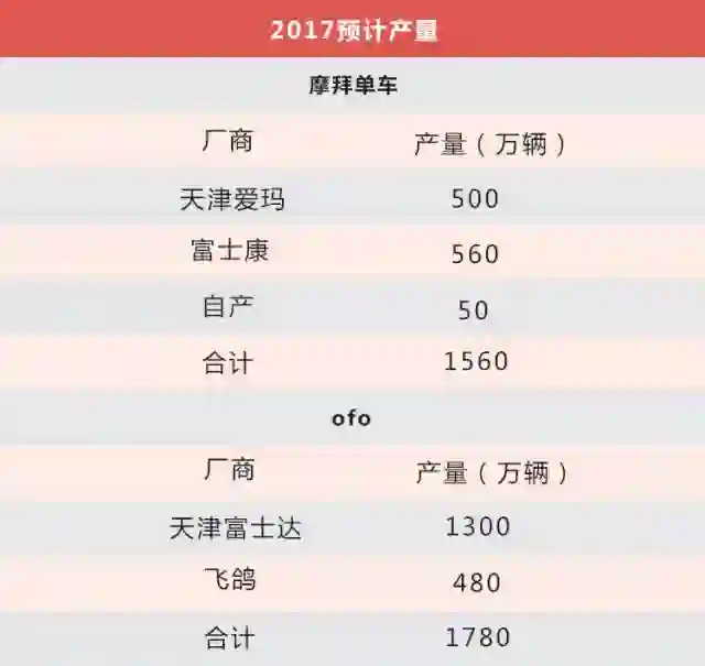 但是摩拜和ofo在2017年预计投放总量将出现“井喷”式爆发,据腾讯科技综合对应供应商产能来看,摩拜和ofo在今年的投放量可以达到3000万辆。
