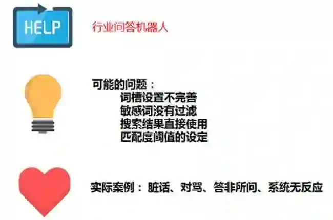 在我们实际测试过程中,发现很多问答机器人是存在词槽设置不完善、敏感词没有过滤、搜索引擎答案直接相互返回以及匹配度阈值的设定。我主要跟大家讨论敏感词的过滤问题,大家能够在网上看到真实案例的新闻,比如亚马逊的音箱去年年底说出一些不恰当的话,最后被迫下线一个月。可能这些问题不是那么传统意义上的安全问题,但它可以直接导致我们的AI系统达到被下线的程度。