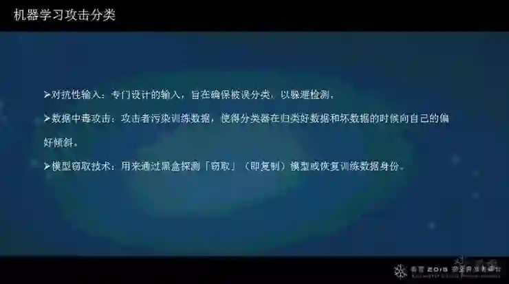 现在机器学习的安全问题在国内安全会议上已经讨论得不少了,其中主要集中在三类:一类是对抗性输入,专门设计的输入,往往是主要用来让AI的分类器进行误分类以躲避检测,比如恶意软件的检测和恶意流量的检测。第二类是数据中毒攻击,攻击者主要是用来污染训练数据,因为很多机器学习模型需要在训练数据的基础上进行训练,一旦污染了数据之后,训练出来的模型也会产生很大的影响。第三类是模型窃取技术,通过探测把一些看不到具体代码的模型,可以把模型分类曲线、分类决策面复现出来。