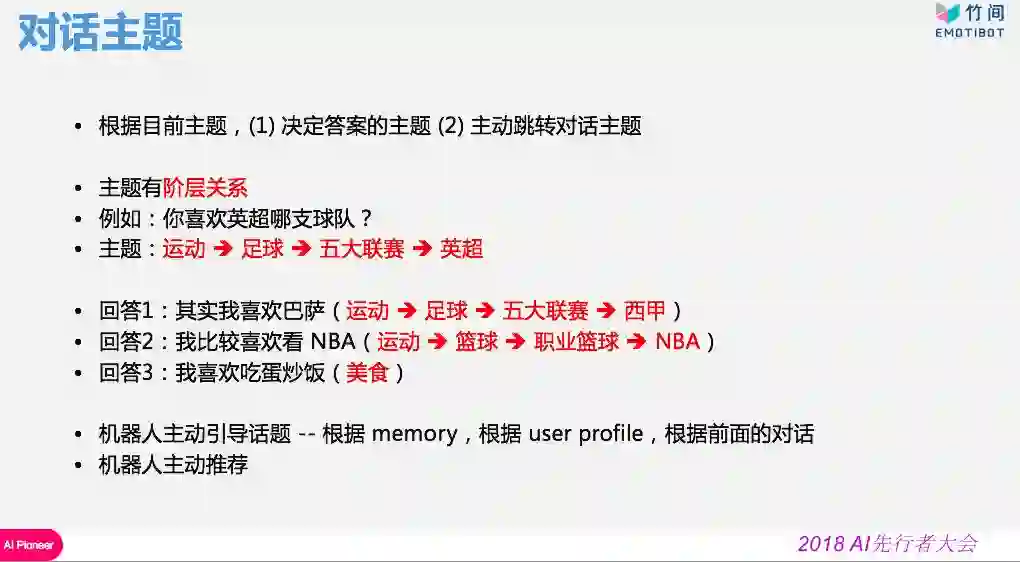 因此,如果机器人拥有长短时记忆及上下文理解,它可能有机会在对话无法继续时主动跳转主题来引导话题。根据这样的能力以及用户画像,机器人不再被动,反而能做到主动式推荐。