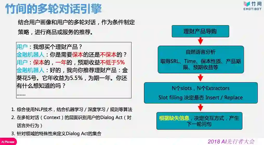 目前的数据中,用户在和机器人有效对话后,67%用户因为答案看不懂转人工,25%用户问了机器人不会的新问题转人工,8%的用户决定决定转人工是因为算法匹配错误。因此即使将算法做到完美,也只解决了8%的问题。当下所需要的交互方式应该是以对话、主动的方式才能有效解决用户问题。
