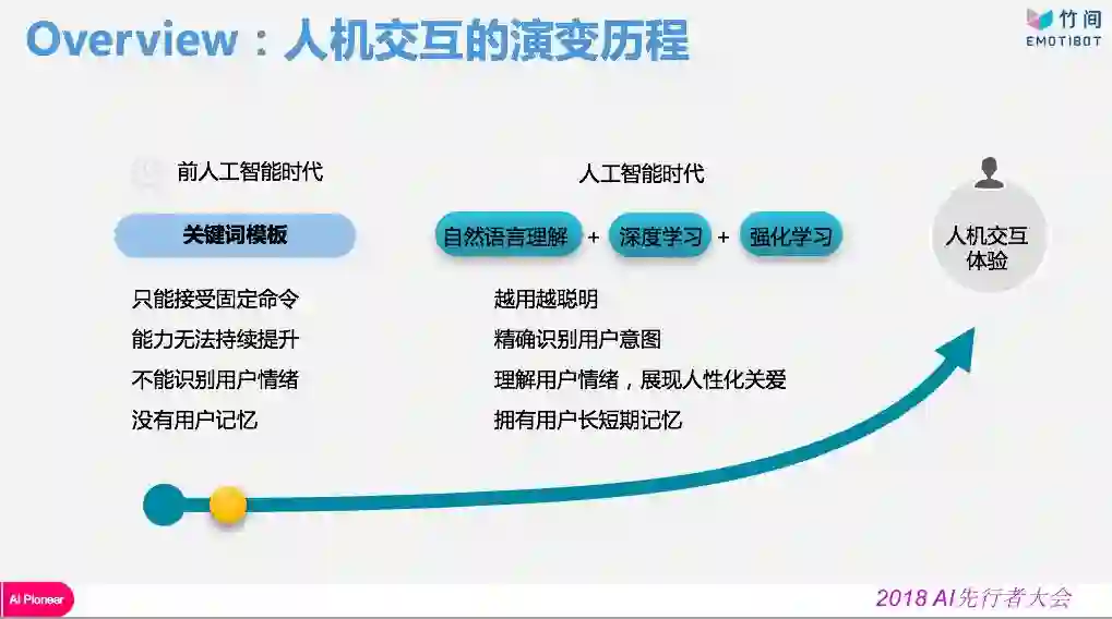 人机交互并非近年才存在,过去,人机交互依靠指令式进行,从三十年前DOS时代一行行的指令,渐渐到Windows的鼠标,再至手机、平板的触控式屏幕,由于这些交互设备的特性,使得关键词模版得以回应使用者。然而其带来的劣势也显而易见,因只能接受固定命令,因此无法提升机器能力,在无法识别用户情绪下,也难以理解用户,遑论拥有用户记忆。