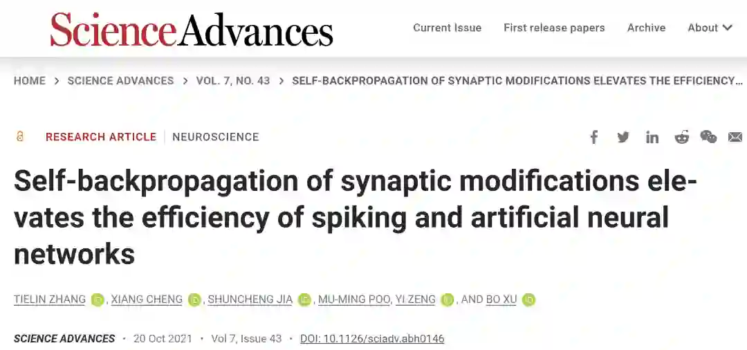 相关工作(Self-backpropagation of synaptic modifications elevates the efficiency of spiking and artificial neural networks)于2021年10月20日在线发表于《科学》子刊《Science Advances》上。中国科学院自动化研究所类脑智能研究中心张铁林副研究员为第一作者,徐波研究员为通讯作者,程翔(博士生)、贾顺程(博士生)、蒲慕明研究员和曾毅研究员为共同作者。相关研究工作得到了国家自然科学基金委、先导B等项目的资助。