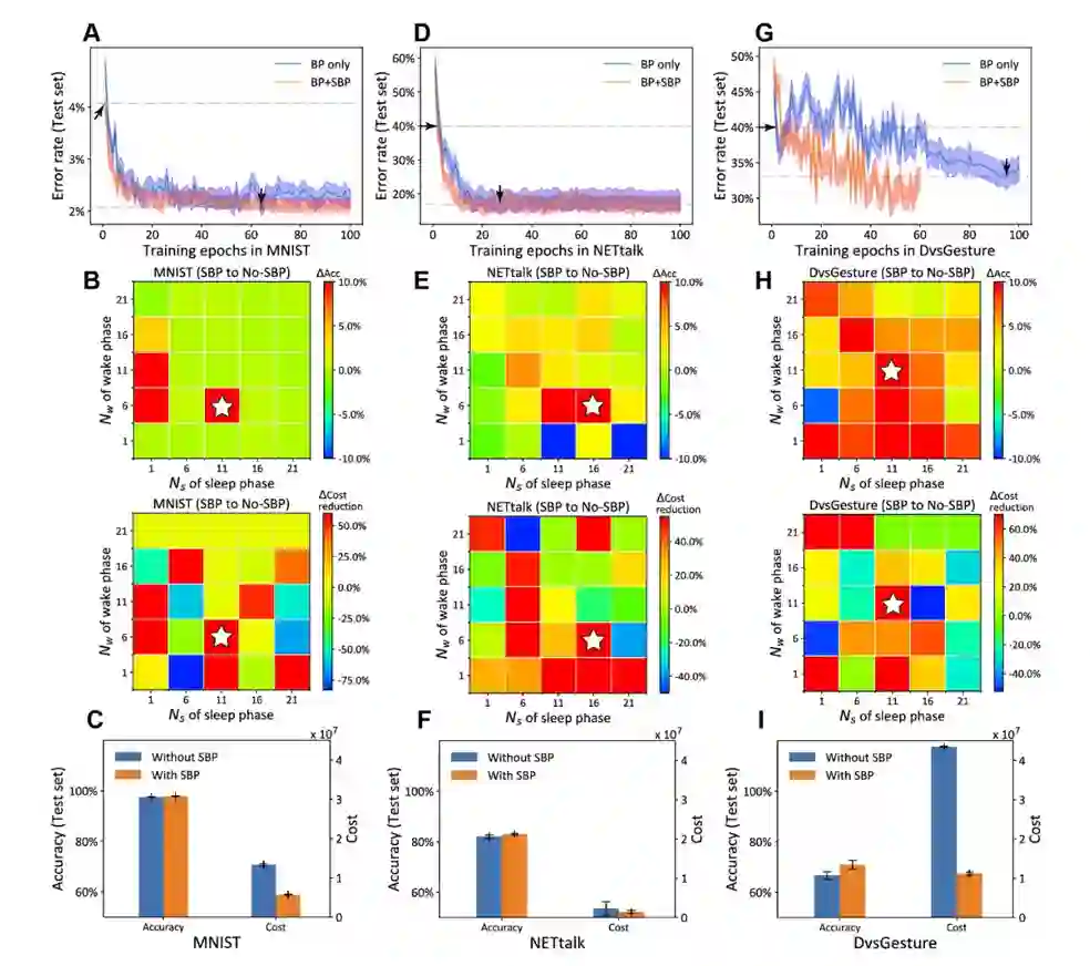 (D-I)在NETtalk和DvsGesture数据集中,SBP得到了和在MNIST中类似的结论。