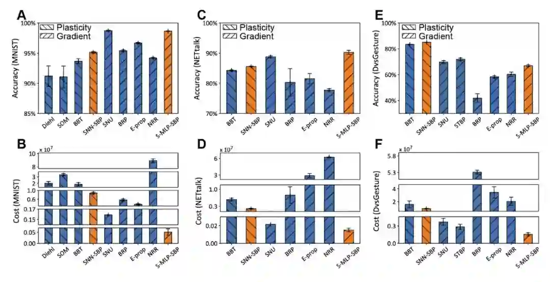 (A,C,E)SBP分别取得了基于梯度和基于可塑性方法的SNN最优性能