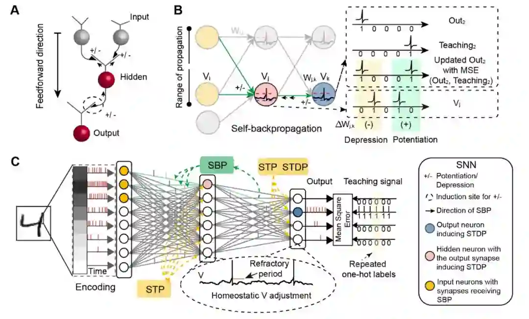 (A)SBP可塑性机制 (B)SBP在SNN中的局部反向传播 (C)SBP和其它可塑性机制在SNN中的组合优化。