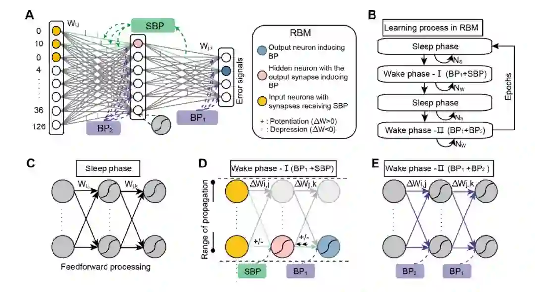 (A)SBP和BP在RBM中的组合优化(B)SBP和BP的交替协作流程(C)RBM中的标准Sleep Phase(D)含有SBP的Wake Phase(E)含有BP的Wake Phase