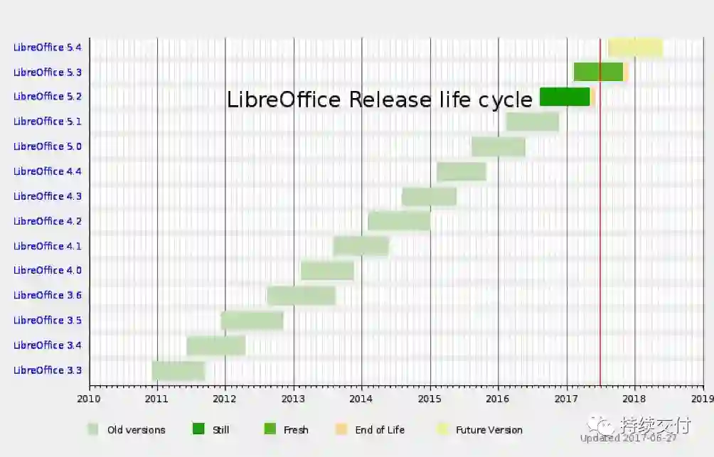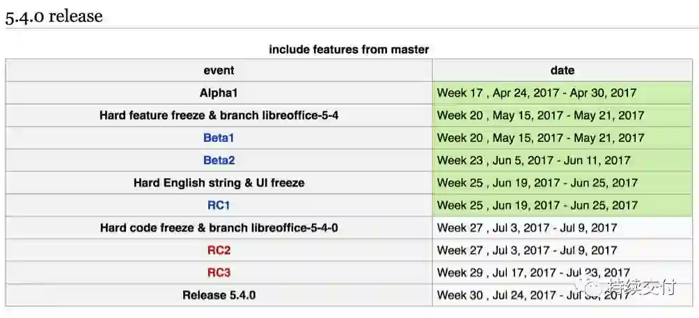 2. 整个生命周期中各个阶段及预定日期,如下图(LibreOffice5.4版本火车的时间表 )所示