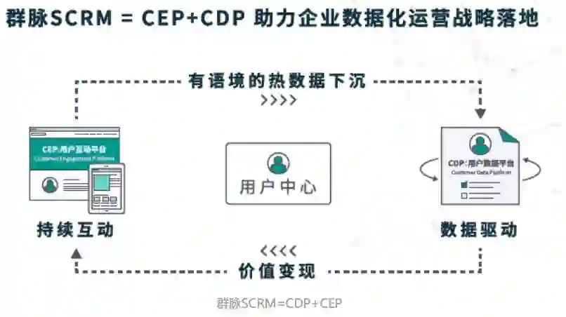 “群脉SCRM打造的是一个用户生态数字化运营平台,由用户数据平台和用户互动平台共同驱动:以用户为中心,持续互动驱动数据变现;反过来,有价值的数据继续驱动与用户的持续互动,形成‘高销售转化’的效能”。”
