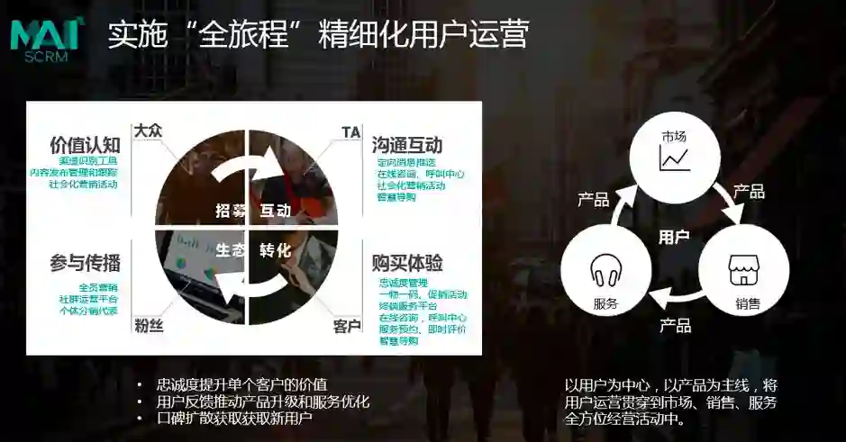 通过招募、互动、转化到生态,群脉会实施从获取到留存再到持续价值挖掘的全旅程客户经营;以用户为中心,以产品为主线,将用户运营贯穿到市场、销售、服务 全方位经营活动中。