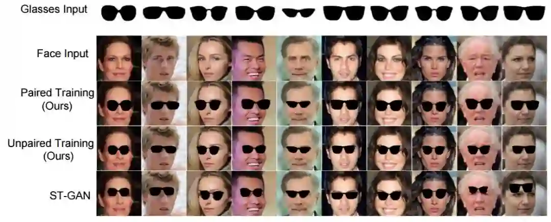 图 4:面部-太阳镜组合任务的测试样例。前两行表示输入的太阳镜图像和面部图像,第三行和第四行分别表示用配对和未配对数据训练的组合 GAN 的输出。最后一行表示 ST-GAN 模型生成的图像。