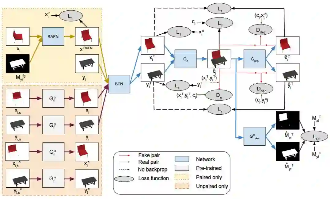 我们的工作重点是将两个目标组合的问题重构为先组合好给定的目标图像以生成可以对目标交互关系建模的联合图像,再将联合图像分解,以获得单个目标。这样的重构可以通过组合-分解网络加强自洽约束 [37]。但在一些场景中无法用组合合成图像对相同的目标实例的成对样例进行访问,例如,要根据给定桌子和椅子的图像生成联合图像,除了指定的桌子外我们可能没有任何有关指定椅子的样例,但我们可能有其他桌子和椅子的图像。我们在组合分解层添加了修复网络,以处理这样的不配对情况。