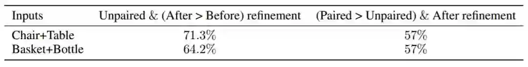 表 1:AMT 用户评估比较我们提出的模型的不同组件。第一列表示在未配对场景中推理(未细化)期间要细化的图像的偏好百分比。第二列表示与未配对情况相比,通过配对数据训练策略生成的细化图像的偏好百分比。