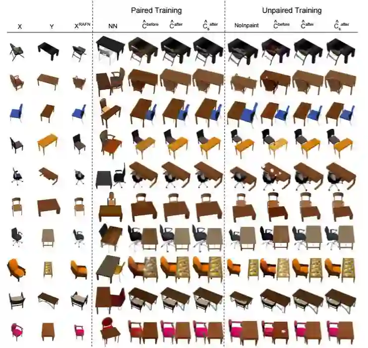 图 2:使用配对或未配对数据训练桌椅组合任务的测试结果。「NN」代表成对训练集中最接近的图像,「NoInpaint」表示在没有修复网络的情况下未配对模型的结果。在配对和未配对情况中,cˆ before 和 cˆ after 分别表示在推理细化网络之前和之后的生成器的结果。cˆ after s 表示细化步骤后的有遮掩的转置输入的总和。