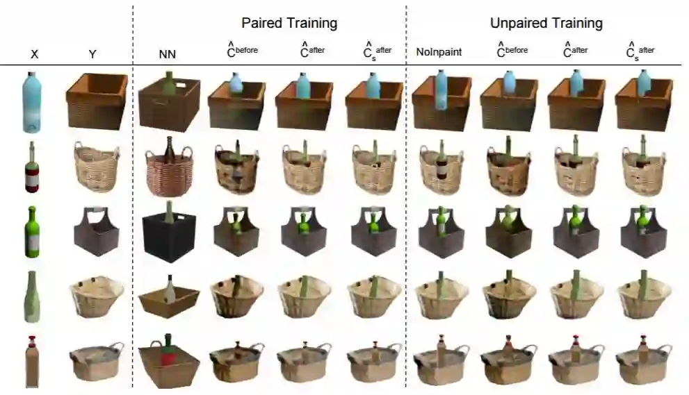 图 3:用配对或未配对数据对篮子-瓶子组合任务训练后的测试结果。「NN」表示在配对的训练集中最近的图像,「NoInpaint」表示在没有修复网络的情况下用未配对数据训练得到的模型。在配对和未配对情况中,cˆ before 和 cˆ after 分别表示在推理细化网络之前和之后生成器的输出结果。此外,cˆ after s 表示细化步骤之后遮掩情况下转置输入的总和。